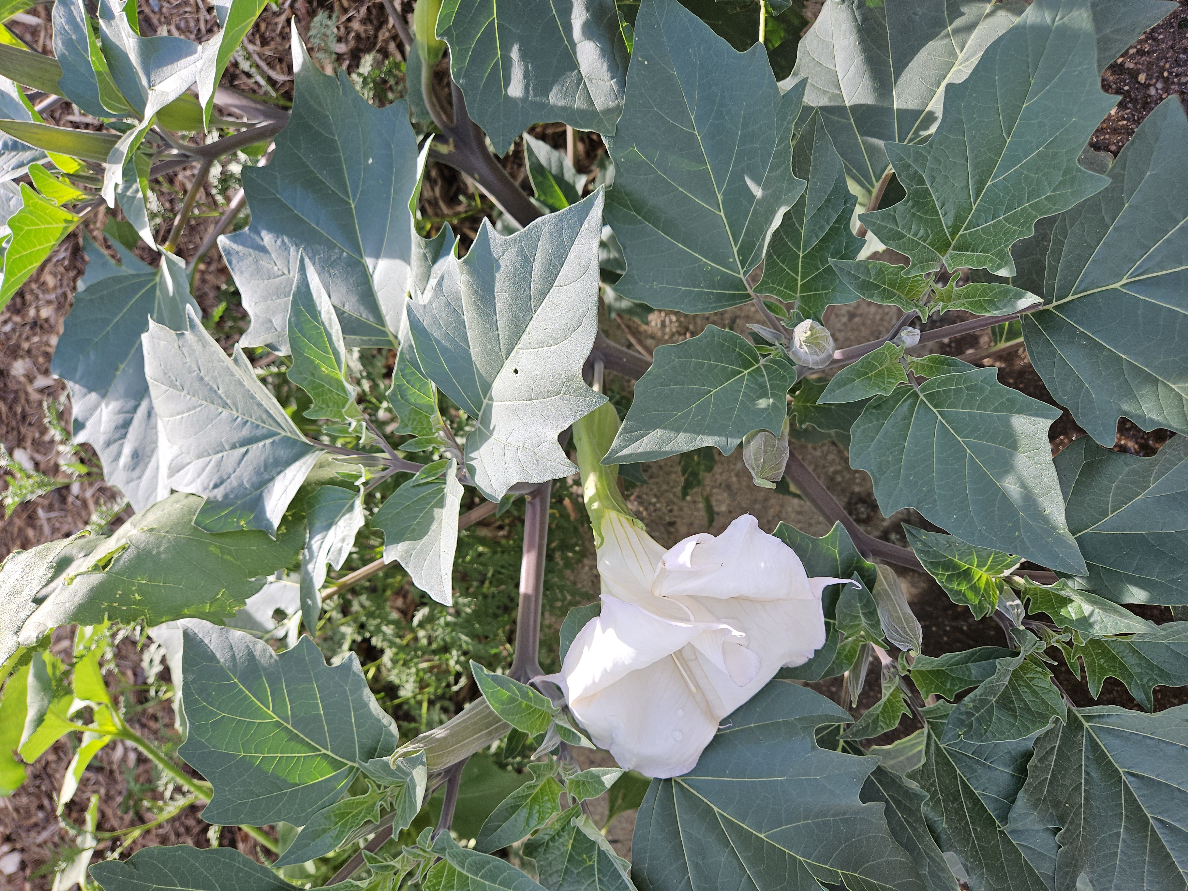 The plant in the photo appears to be a Datura species, most likely Sacred Datura (Datura wrightii), also known as jimson weed. This plant is famous for its striking, large, white trumpet-shaped blossoms and its broad, bluish-green, deeply lobed leaves. In the wild it forms a bushy shrub or short-spreading perennial with pale, often purple-tinted stems. The flowers are typically 10–20 cm (4–8 in) long and open mainly in the late afternoon or at night, releasing a strong and sweetish fragrance that attracts night‑flying pollinators such as hawk moths. After flowering, the plant develops round to pear-shaped spiny seed capsules (thorn apples) that contain numerous seeds. All parts of Datura contain tropane alkaloids (atropine, hyoscyamine, scopolamine) and are highly toxic if ingested, underscoring the need for careful handling and placement away from children and pets. This makes the plant both captivating and hazardous, which is why it is often grown with respect and caution in ornamental gardens, rockeries, or desert landscapes where it can be admired while remaining out of reach of curious hands.