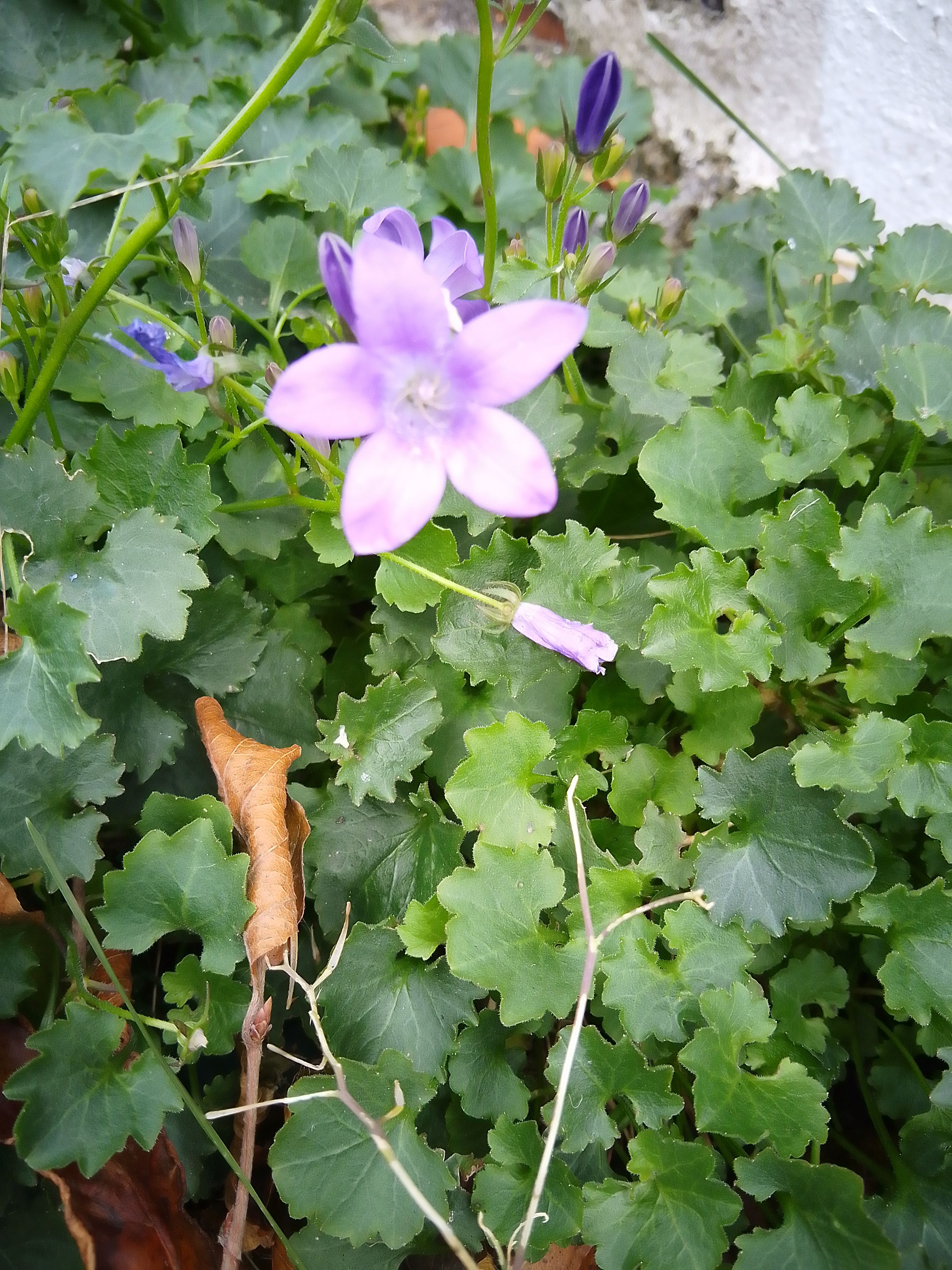 The plant shown in the photo appears to be a creeping Campanula, a low-growing, spreading perennial that forms a dense carpet of foliage and sends up slender flowering stems. The lilac to blue-purple, five-petaled flowers are star-shaped and sit above a mat of leafy groundcover. The leaves are rounded to kidney-shaped with shallow, lobed margins and a slightly hairy or textured surface, contributing to a compact, rock-garden or border-friendly habit. This combination—a creeping, evergreen to semi-evergreen groundcover with delicate, starry flowers on wiry stems—matches commonly sold forms of Campanula portenschlagiana (Dalmatian bellflower) and other creeping Campanula species such as Campanula poscharskyana. While a precise species cannot be guaranteed from a single photo, the overall growth form, leaf shape, and flower morphology are characteristic of these creeping bellflowers. Overview and natural habit - Growth habit: Low, spreading groundcover that forms a dense mat. It is well suited to rock gardens, container edging, borders, and naturalizing in loose soil. In milder climates it can naturalize and cover larger areas, but it is typically grown as a controlled edging or rock garden plant. - Foliage: Leaves are rounded or heart-shaped at the base with irregular, shallow lobes or teeth along the margins. They form a lush green carpet that remains attractive through the growing season, especially when the plant is not in bloom. - Flowers: The flowering stems rise above the foliage and bear five-petaled, star-shaped blossoms in shades of blue, violet, or lavender. The petals are typically evenly proportioned, creating a delicate, almost celestial look—hence the common name “bellflower” for the genus. The center of each flower is lighter, often with a pale throat, and the bloom is generally long-lasting when conditions are favorable. Care and cultural requirements - Light: Creeping Campanulas prefer full sun to light shade. In hotter climates, some afternoon shade helps prevent leaf scorch and extends bloom longevity. In full sun, expect more compact leaf growth and vigorous flowering. - Soil and drainage: They thrive in well-draining soil. A sandy, loamy mix is ideal. Good drainage is crucial; otherwise roots may rot in wet winters or overly rich, compact soils. They tolerate average garden soils but will perform best where water drains readily. - Watering: Water regularly during establishment to encourage a strong root system. Once established, creeping Campanula is relatively drought-tolerant, but it still appreciates regular moisture in prolonged hot spells. Avoid consistently waterlogged soil, which can lead to root rot and fungal issues. - Fertilization: Apply a light, balanced fertilizer in early spring as growth begins. A slow-release formula or a one-time feed with a balanced NPK (such as 10-10-10) works well. Avoid heavy feeding, which can promote excessive foliage at the expense of flowering. - Mulching: A shallow layer of organic mulch helps conserve moisture and suppress weeds, but avoid piling mulch directly against the crowns to prevent rot. In hot climates, mulching can also help moderate soil temperature. - Pruning and deadheading: Regular deadheading encourages continued flowering and prevents the plant from using energy on producing seed. After flowering, you can trim back spent stems to maintain a neat appearance. In areas with severe winters, light pruning in late winter or early spring helps promote fresh growth and a tidier look. - Propagation: Creeping Campanula propagates easily. Options include: - By division: In early spring or fall, lift and divide clump-forming varieties, replanting divisions in well-draining soil. - By layering: In some forms, you can pin down flexible stems to the soil to root and form new plants. - By seed: Campanula species produce seed; sow in spring or early summer for new plants, though cultivars are often more reliably propagated by division or cuttings. - Temperature and hardiness: Most creeping Campanula are hardy to at least USDA zone 4–6, depending on the cultivar. They tolerate cool winters but may need protection in very cold, wet regions. In areas with harsh freezes, provide mulch or move potted plants to a sheltered location. - Pruning specifics for vigor: If the plant becomes congested or starts to look leggy, light shearing after flowering can refresh growth and improve air circulation, reducing disease pressure. Avoid heavy pruning that could remove next season’s flowering wood. Pests, diseases, and problems to watch for - Pests: Slugs and snails can be a problem in damp, shady spots, particularly with tender new growth. Aphids and occasional caterpillars may appear on new shoots. Regular inspection helps catch issues early. - Diseases: Powdery mildew can occur in humid, crowded conditions. Ensure good air flow and avoid overhead watering. Root or crown rot may occur if soil remains waterlogged or if drainage is poor. - Weeds and competition: Because creeping Campanula forms a mat, it can be crowded by aggressive weeds or unusually vigorous neighboring plants. Mulching and routine weeding around the edge of the bed helps maintain vigor where desired. Design tips and companion planting - Use in rock gardens, slopes, or borders where a low-growing, long-blooming plant adds color without overwhelming space. - Pair with other drought-tolerant, sun-loving perennials such as thyme, sedum, or ajuga for textural contrast and extended color combinations. - In containers, combine with trailing annuals or compact perennials. Ensure the pot has good drainage and that the soil dries out slightly between waterings to prevent rot. - For color variety, consider cultivars with white or deeper blue flowers if available. Seasonal changes in soil moisture and temperature can influence shade intensity in some cultivars. Maintenance and lifecycle notes - Longevity: Creeping Campanula can form a durable, long-lasting groundcover if