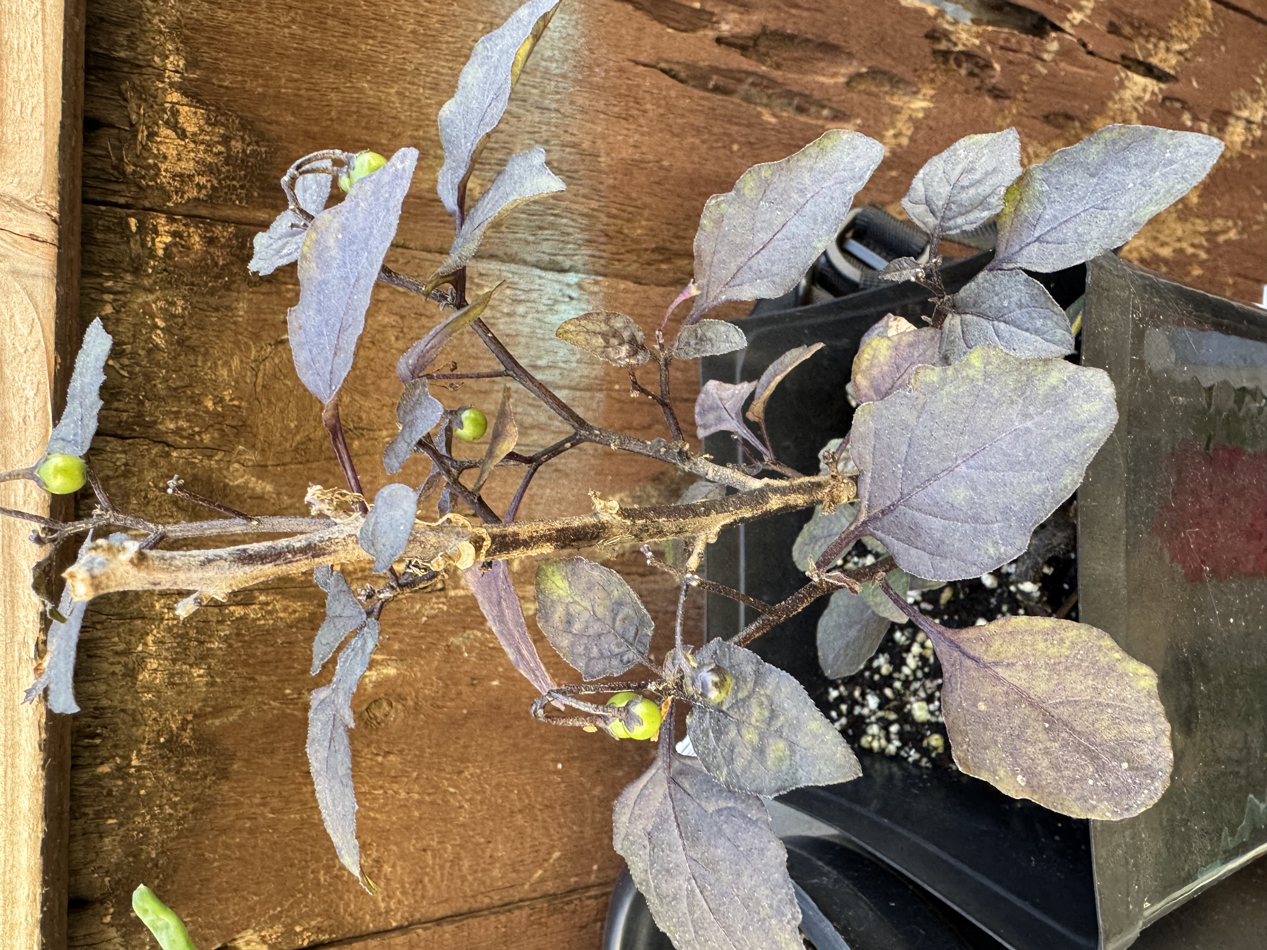 Identification and overview: The plant in the photo appears to be a Capsicum annuum, a pepper plant, with unusually purple to blue-gray foliage and small green berries forming at the leaf axils. This combination—upright, branching habit; oval, slightly wavy leaves that carry a dusky purple tint; and tiny round fruits that are green while immature—is characteristic of many ornamental pepper cultivars. While the exact cultivar name cannot be confirmed from a single image, the features strongly align with an ornamental pepper variety that is often grown in containers for color. In many such cultivars the foliage is colored or booted with anthocyanin pigments, which can deepen with sun exposure, cooler temperatures, or nutrient changes, and the fruits are small and cherry-like, eventually ripening to a color that depends on the specific cultivar. The plant’s form—a compact, multi-branched stem system with leaves arranged along the stems and fruit produced at the leaf axils—fits the typical growth habit of small potted ornamental peppers. With that caveat, the following care and cultivation guidance should help you nurture this plant whether it remains ornamental or, if the fruits are edible in your cultivar, used for culinary or educational purposes. Description of the plant and where it grows best: The plant in the image is a small, woody-stemmed pepper plant with a somewhat upright to spreading habit. Leaves are oval to lance-shaped, typically 3–8 cm long, and show a striking purple to grayish-purple color that may appear dusty or bluish in certain lighting or if the plant is under some stress. The margins are smooth, and the venation is clearly visible. Stems are slender and may have a brownish hue; in many ornamental peppers the stems can become somewhat woody as the plant matures. Small round peppers, currently green, appear at leaf axils along the stem. In mature plants from this group, the peppers may stay green for a period before turning red, yellow, orange, purple, or other colors depending on the cultivar. The plant pictured is in a container, which is typical for ornamental peppers that are grown for color displays on patios or balconies. Key features you can use to distinguish it: purple to blue-gray foliage, compact branched structure, and tiny round green fruit clustered along stems. The plant’s overall appearance may vary with light, temperature, and nutrient availability. If the leaves begin to turn more deeply purple under bright sun or cooler nights, that is a common response in purple-leaved capsicum cultivars and does not necessarily indicate a problem; it often enhances the ornamental effect. Conversely, leaves that yellow or become severely pale may signal nutrient deficiency or environmental stress that should be addressed with appropriate care. Care and cultivation guidelines (approximate 1000-word overview): Light and temperature - Provide bright, full sun. Ornamental peppers perform best with at least 6 hours of direct light daily. Within a container, placing them where they receive strong sun will help deepen foliage color and promote robust fruiting. - Keep temperatures warm. These plants favor daytime temperatures around 70–85°F (21–29°C) and do not tolerate cold well. Night temperatures above 60°F (16°C) are ideal. If growing indoors, place near a sunny window or use a grow light to maintain light intensity during shorter days. Container, soil, and watering - Potting mix and drainage: Use a well-draining potting mix rich in organic matter. A container with drainage holes is essential to prevent waterlogging, which can cause root rot and foliage problems. - Pot size and repotting: Start in a small to medium container and repot into a larger pot if roots become crowded. A 2–5 gallon pot is commonly suitable for a compact ornamental pepper, though the exact size depends on the plant’s vigor and how long you want it to grow before seasonal changes. - Watering: Keep the soil consistently moist but not soggy. Water when the top inch (2.5 cm) of soil feels dry. Reduce frequency a bit when the plant is flowering but ensure steady moisture as peppers are sensitive to drought stress, which can impact fruit set and color development. Soil fertility and feeding - Fertilization: Use a balanced, water-soluble fertilizer labeled for vegetables or flowering ornamentals. Feed every 2–4 weeks during active growth and fruiting, following label directions. In the fruiting stage, a fertilizer higher in potassium (the middle number on N-P-K) can support flower and fruit development and color formation. - Nutrient balance: Observing a slightly higher phosphorus and potassium profile, with moderate nitrogen, can encourage steady growth and better fruit set without excessively lush vegetative growth that can delay fruit ripening. Pruning, training, and maintenance - Pruning for shape and vigor: If you want a bushier, more compact plant, pinch back growing tips early in the season. This encourages branching and a fuller form, which can improve overall air circulation and reduce disease risk. - Remove dead or diseased tissue: Regularly inspect for yellowing or necrotic leaves and prune them away to improve plant health and reduce the spread of any pests or diseases. - Mulching: A light layer of organic mulch in the container helps retain soil moisture and stabilize temperatures, which is especially useful in warm climates. Pollination and fruiting - Pollination: In outdoor or well-ventilated indoor settings, peppers are pollinated naturally by wind and insects. If fruit set seems poor indoors, you can gently shake the plant or use a small brush to help move pollen between flowers. - Fruit color: The small fruits in ornamental peppers often begin green and progressively color up to red, yellow, purple, or other hues based on the cultivar. Monitor color evolution as a sign of ripening. Harvesting at fruit maturity provides the best taste and the most vivid color