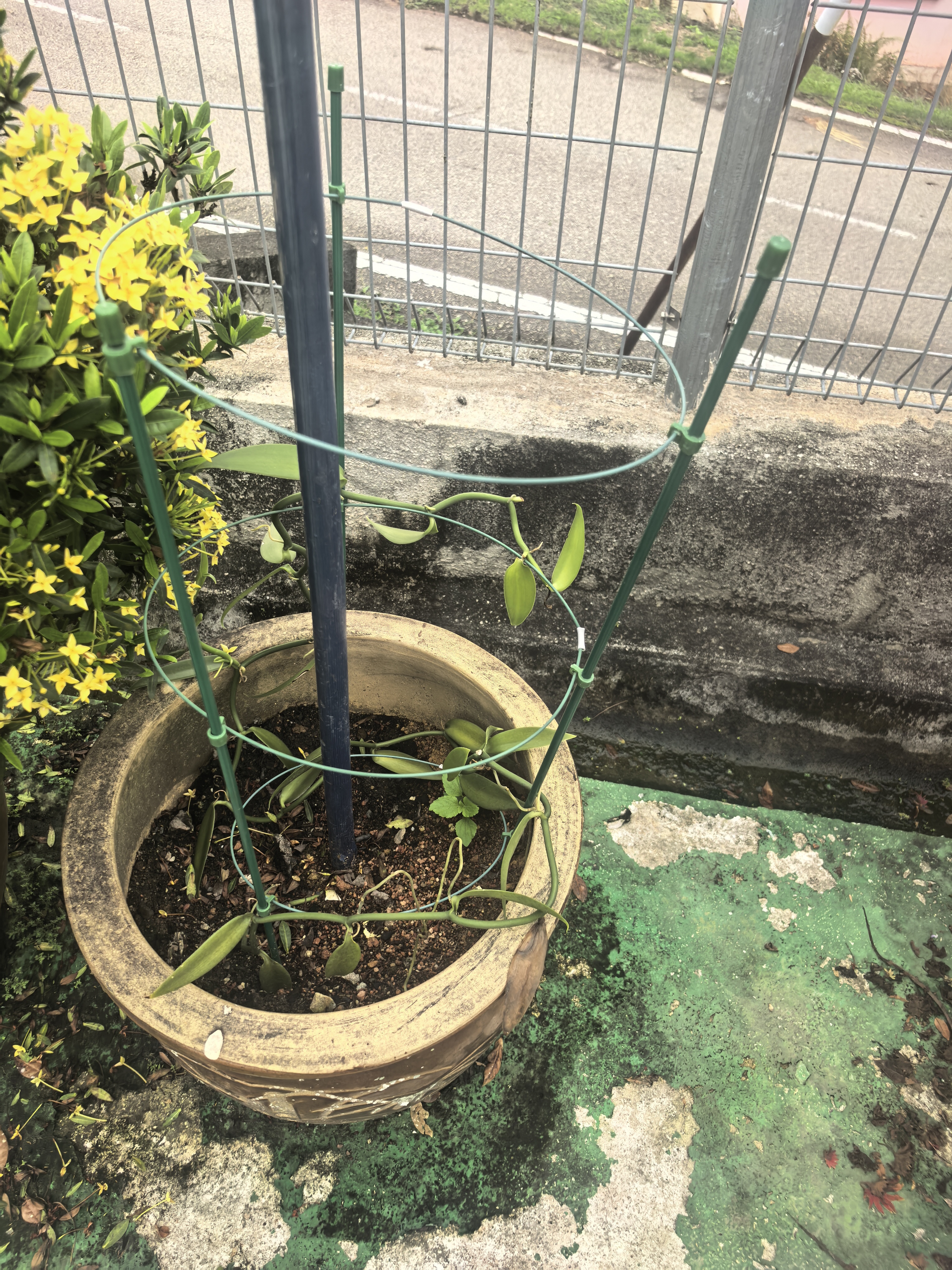 This plant appears to be a tropical climbing vine commonly sold as Mandevilla, with Dipladenia being a frequent closely related name in the trade. In your photo the plant is trained on a circular green support ring attached to stakes, a typical setup for flowering climbers grown in containers. The stems are slender and green, and the leaves are small to medium, glossy green, and simple with smooth margins. The growth habit is that of a twining or climbing vine, which would normally produce showy, funnel‑shaped flowers when in season. The leaves look healthy and firm, suggesting the plant is in either a warm outdoor location or a bright sunny indoor spot. While there are many cultivars, the general picture matches a Mandevilla/Dipladenia type: a glossy-leaved, evergreen tropical vine that is prized for its long, continuous flowering when given proper conditions. The plant you have is most typically grown in pots, on a trellis or ring support, to create a vertical accent in a balcony, patio, or garden corner. For care guidance, I’ll describe the key characteristics of the plant, its preferred environment, and practical steps to keep it thriving and flowering well. Character and features: - Leaves: Opposite pairs, simple, oval to lanceolate, about 2–7 cm long depending on the exact cultivar. They are glossy, leathery, and a rich green color, with relatively smooth edges. The leaf surface contributes to the overall tropical look of the plant. - Stems: Woody to semi‑woody as the plant matures, with slender, climbing vines that can twine around supports. In a container, they are often trained around a ring, stake, or small trellis to encourage vertical growth. - Flowers: While not visible in the photo, Mandevilla flowers are its standout feature. They are typically large, trumpet‑shaped or funnel‑shaped blossoms with five petals, coming in colors such as pink, red, white, or coral. The flowers are usually showy and long‑lasting during warm months, and their presence is a strong indicator of a healthy, well‑cared‑for plant. - Growth habit: Fast‑growing, climber or trailing vine. It can reach several feet in warm climates if supported and given adequate light, water, and fertility. In container culture, regular pruning helps maintain shape and encourages abundant flowering. - Tona and use: A popular choice for containers on patios, balconies, or near entrances. It’s commonly sold as a vine that can be trained on a ring, trellis, or stake, making it an excellent focal point with relatively straightforward care. Care and cultivation (approximately 1000 words): Mandevilla is beloved for its spectacular blooms, but to sustain that flowering and keep the plant healthy, it needs bright light, warmth, and a steady, well‑drained watering routine. Here is a practical guide to growing this plant successfully in a pot, with a focus on the situations suggested by your photo (a pot with a support ring, near a fence or wall). Light and location: - Light: Mandevilla thrives in full sun. Aim for at least 6 hours of direct sunlight per day for the best flowering, especially in spring and summer. In very hot climates, a few hours of afternoon shade can prevent heat stress and leaf scorch, but try to keep it in bright light overall. Indoors, place the plant near a south‑ or west‑facing window where it can receive strong light for most of the day. - Placement: In a container on a patio or balcony, position the plant where it can freely twine around the ring or trellis. Avoid shaded corners that limit flowering. If grown indoors, ensure good air movement to reduce fungal issues. Temperature and humidity: - Temperature: Mandevilla is a warm‑weather plant. It prefers average indoor temperatures in the range of 60–85°F (15–29°C). Protect it from cold drafts and temperatures below about 50–55°F (10–13°C). In outdoor settings, bring it indoors or provide protection during frosty nights in temperate regions. - Humidity: It tolerates normal indoor humidity, but slightly higher humidity helps with bloom and overall vigor. If your air is very dry, especially in winter, occasional misting can be beneficial, provided you don’t leave the leaves damp for long periods. Watering and soil: - Watering: Keep the potting mix evenly moist during the growing season, but avoid waterlogging. The top 1–2 inches of soil should feel lightly dry before you water again. In hot weather, you may need to water more frequently. In cooler seasons or when growth slows, reduce watering to prevent root rot. - Soil: Use a well‑draining potting mix. A standard mix for container Vines with some organic matter is suitable. Adding a bit of perlite or sand can improve drainage. The pot should have drainage holes to prevent water from sitting at the bottom. - Pot size and refresh: As the plant grows, consider a larger pot to accommodate root development and ongoing flowering. If the plant becomes root‑bound, you’ll see reduced vigor and flowering; repotting to a container only slightly larger than the current one helps keep the plant productive. Fertilization and feeding: - Fertilizer: During the active growing and flowering season, feed every 2–4 weeks with a balanced, water‑soluble fertilizer (for example, a 20‑20‑20 or similar ratio) or a fertilizer formulated for flowering plants. A fertilizer higher in phosphorus can help promote bloom. Follow label directions to avoid overfertilization, which can lead to lush green foliage with fewer flowers and possible salt buildup in the pot. - Winter feeding: In winter, when growth slows, reduce or stop fertilization to avoid weak growth. Pruning and training: - Pruning: Prune after flowering or in late winter to keep the plant compact and encourage bushier growth. Remove dead or damaged wood and trim long, leggy canes to maintain a pleasing shape and to stimulate new flowering shoots. If you want a robust climber, pinch young growth to encourage branching